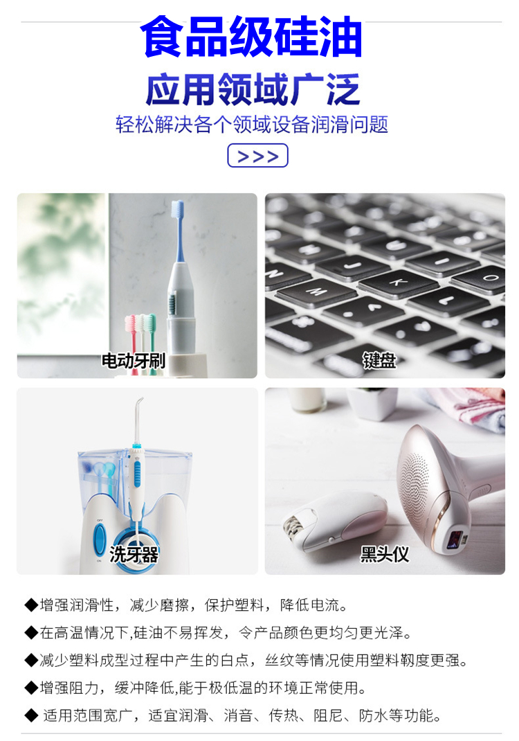 由于食品級(jí)潤(rùn)滑油對(duì)添加劑及生產(chǎn)工藝的嚴(yán)格要求,不是所有品牌都有食品級(jí)產(chǎn)品。富興食品級(jí)二甲基硅油是食品級(jí)潤(rùn)滑油的一種,必須具有特殊的滑爽性、柔軟性、憎水性,良好的化學(xué)穩(wěn)定性、優(yōu)異的電絕緣性和耐高低溫性閃點(diǎn)高、凝固點(diǎn)低,可在-50℃~+300℃下長(zhǎng)期使用,粘溫系數(shù)小、壓縮率大,表面張力低,憎水防潮性好,比熱導(dǎo)熱系數(shù)?。煌瑫r(shí),還不含有毒物質(zhì),不會(huì)對(duì)產(chǎn)品造成污損。